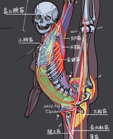 Vemos huesos y músculos de los brazos y cómo se conectan al torso.