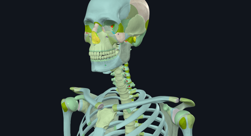 Usamos un cráneo desmontable para conocer cada uno de los huesos que lo forman. Aprendemos a dibujarlo, como base para luego dibujar caras, y vemos las estructuras internas del encéfalo (cerebro, sistema límbico, etc). Estudiamos los músculos y vasos sanguíneos del cuello (carótida, yugular...), y la laringe.